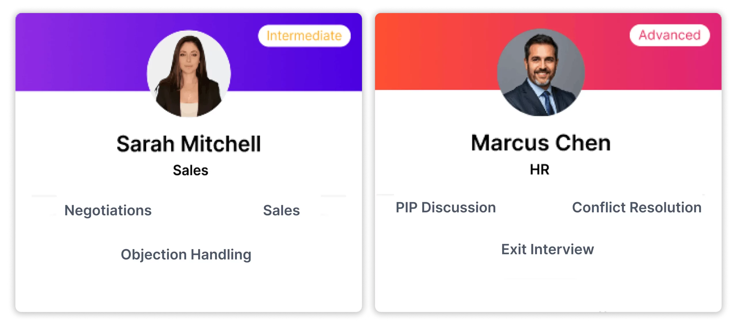 Roleplay Training is useful for Sales, HR, Marketing, Compliance, Training, and many other departments that require real-world scenario practice.