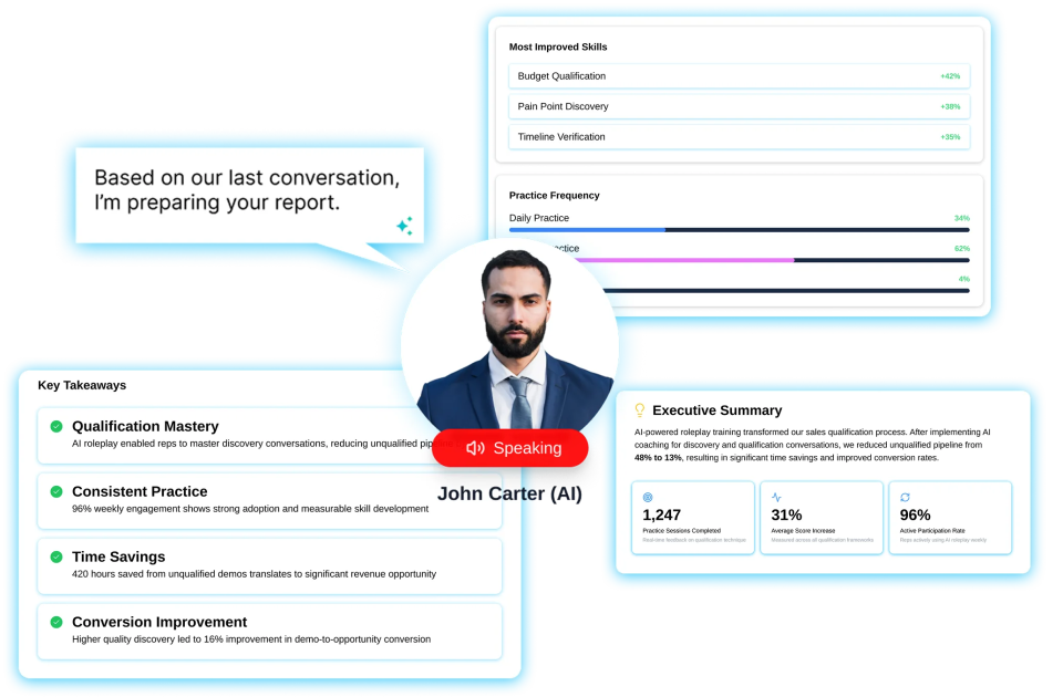 By reducing trial-and-error on real prospects, AI Roleplay for Sales improves qualification, objection handling, and closing skills—leading to faster ramp-up and stronger pipeline outcomes.