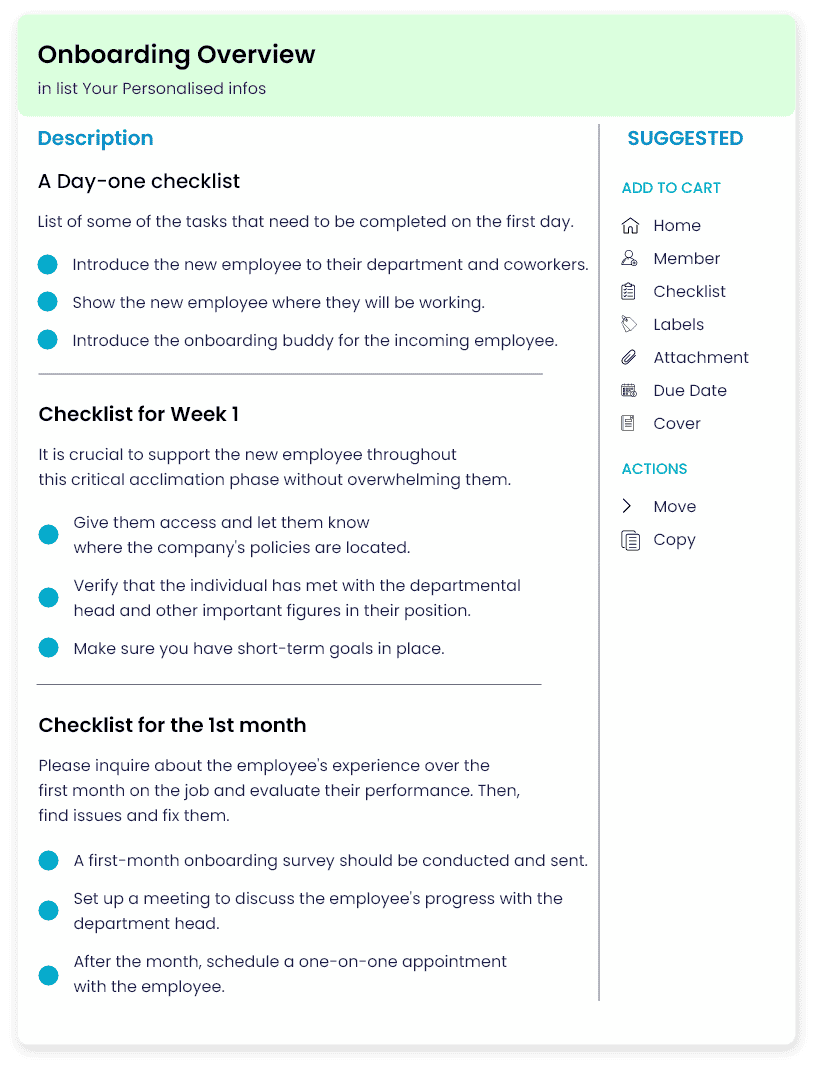 To make things easier and more organized during the onboarding process, it’s a good idea to break your templates into different sections for each stage. You might need different sections depending on the job and how your company does things. When creating your onboarding plan template, setting goals for the new employee’s first day, week, and month on the job is helpful. This way, they’ll clearly understand what’s expected of them and what they need to accomplish.