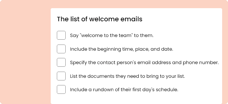 An onboarding checklist is a helpful tool for hiring managers to keep track of the necessary steps to guide new hires through their first days and months at a company. In addition, it helps ensure that all the critical stages of the onboarding process for a particular job role are complete. However, simply completing an onboarding checklist template does not guarantee a successful onboarding experience for the new hire.