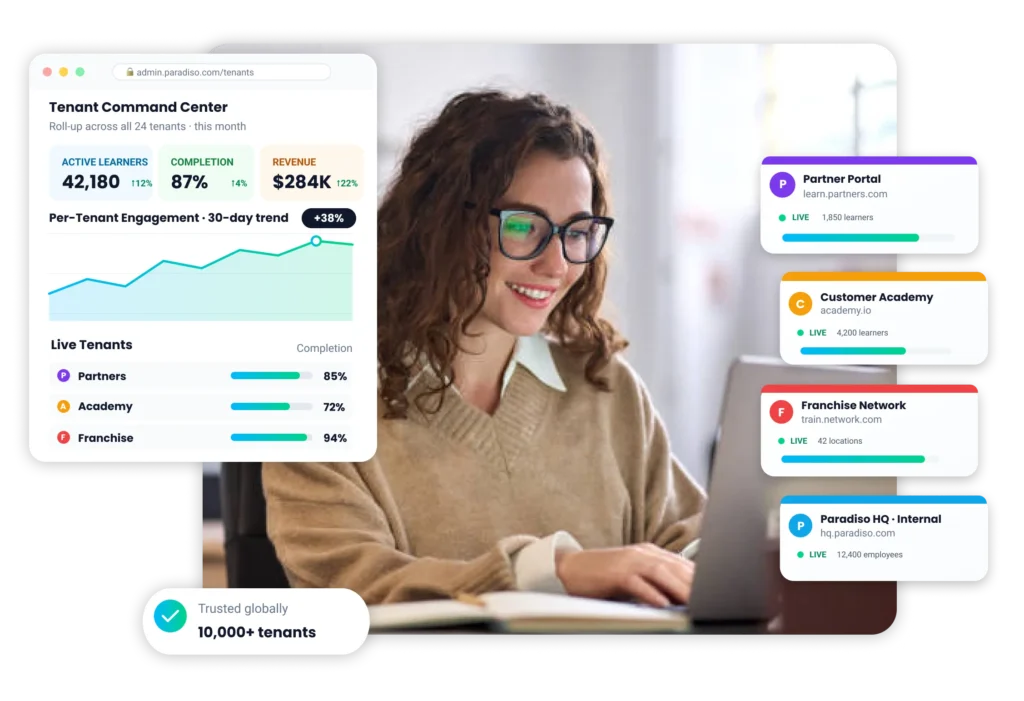 Paradiso’s multi-tenant LMS was built for global enterprises. Each tenant runs in its own language, its own currency, and its own regional compliance regime — without a single line of custom code.