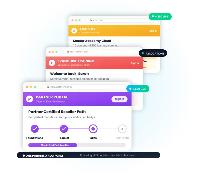 Train partners, resellers, distributors and customers with the same platform you use internally - but keep each audience in its own branded portal with its own user base, course catalogue and reporting. One Paradiso instance, unlimited external audiences.